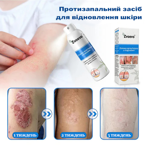 Спрей Zvoevo® Magnesium Repair Spray проникає глибоко в шкіру, м’яко очищаючи її зсередини та швидко знімаючи свербіж і запалення, спричинені псоріазом. Формула без стероїдів та подразників є безпечною для чутливої шкіри й підходить людям із дерматологічними проблемами.