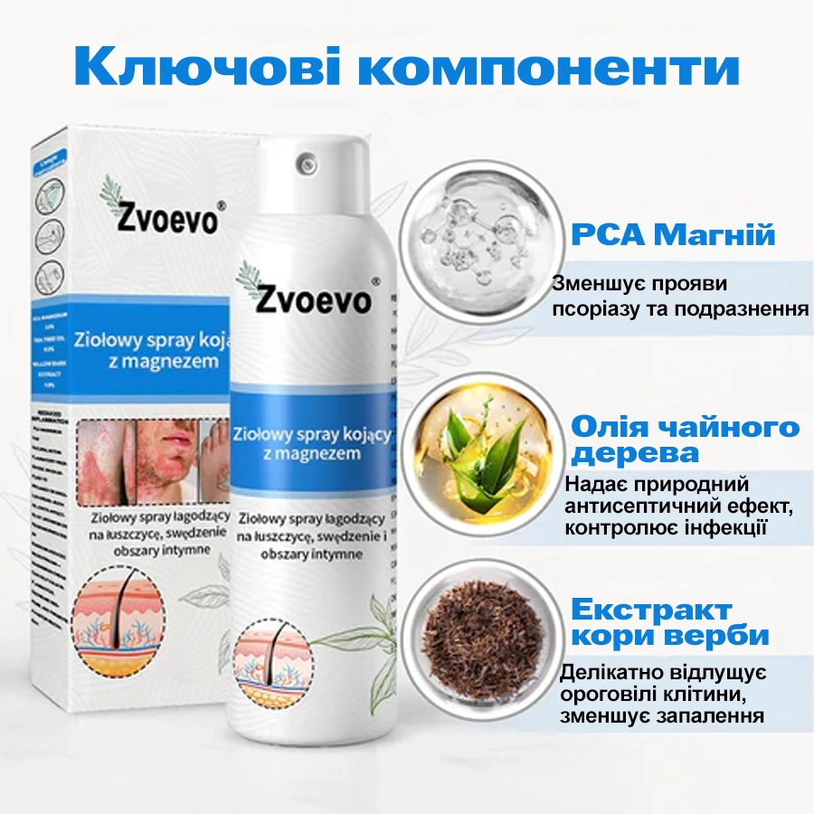 Спрей Zvoevo® Magnesium Repair Spray проникає глибоко в шкіру, м’яко очищаючи її зсередини та швидко знімаючи свербіж і запалення, спричинені псоріазом. Формула без стероїдів та подразників є безпечною для чутливої шкіри й підходить людям із дерматологічними проблемами.