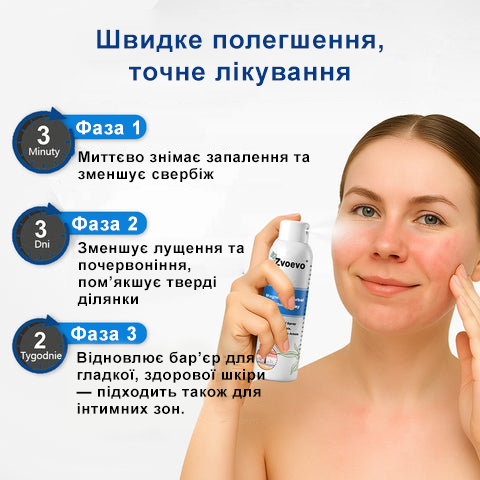 Довго страждала від екземи на спині — постійний свербіж і біль не давали спати. Подруга порадила спрей Zvoevo®, і вже через тиждень висип зник. Біль і свербіж повністю пройшли. Нарешті знайшла засіб, який справді працює!