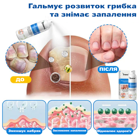 Для терапії застосовується лікувальний спрей із протигрибковими компонентами. Активні речовини сповільнюють ріст і розмноження грибків, покращують зовнішній вигляд і здоров’я нігтів.